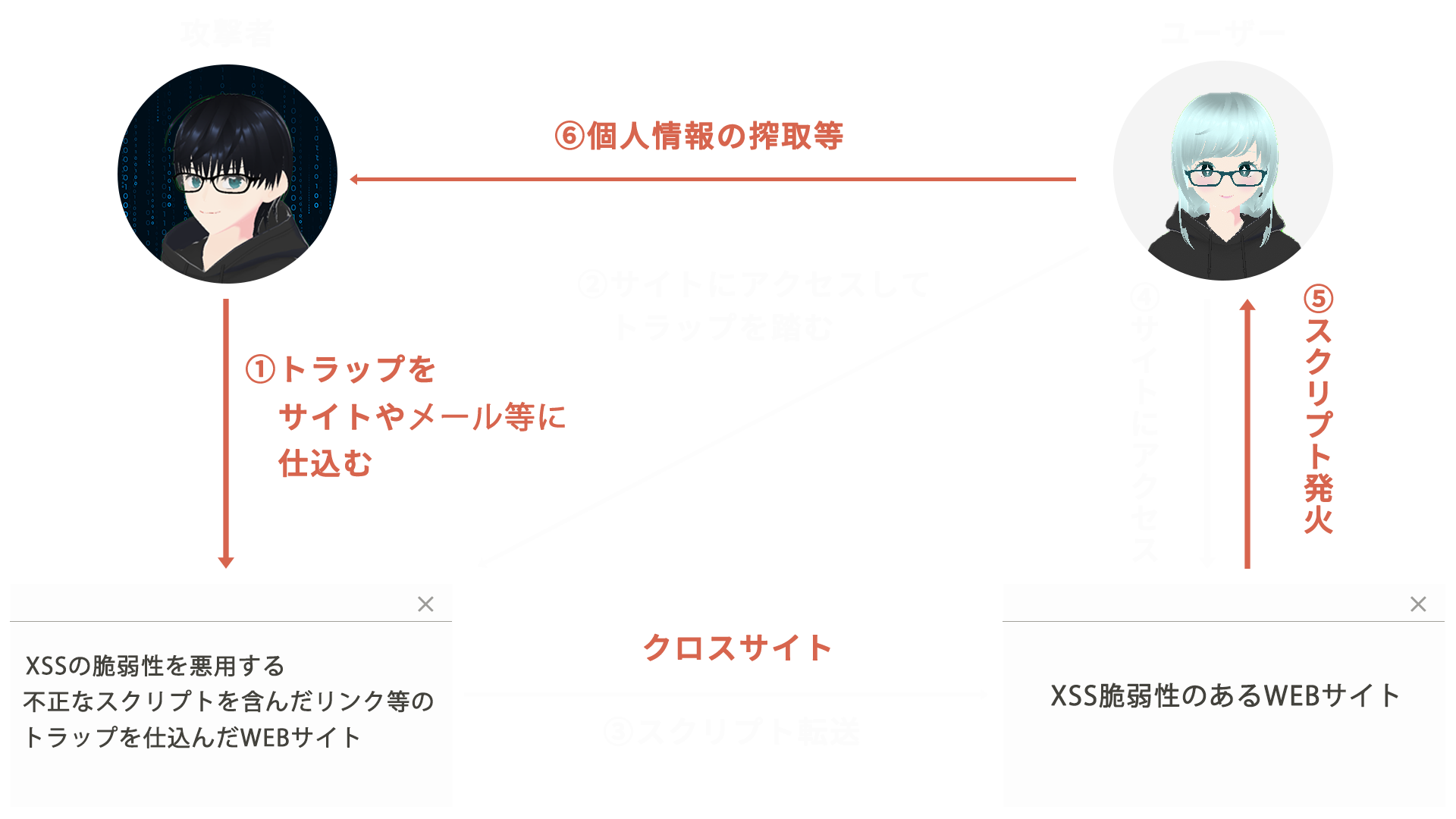 反射型XSSは、攻撃者が不正なスクリプトを含むリンクを作成し、トラップサイトやメールに配置します。ユーザーにトラップを踏ませ、XSS脆弱性のあるWEBサイトにアクセスさせます。その際にユーザーのブラウザで不正なスクリプトを起動させる仕組みです。